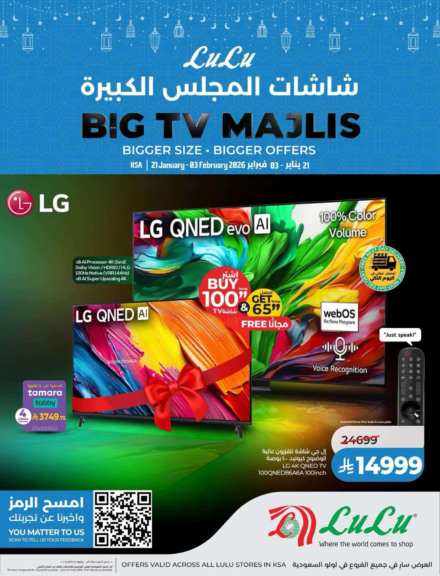 عروض لولو السعودية الاسبوعية الخميس 22-1-2026 الموافق 3 شعبان 1447هـ و تحتوي علي تشكيلة متنوعة من شاشات التلفزيون من ماركات معروفة و موثوقة لضمان جودة المنتج و بتوفر ايضا السماعات و اكسسوارات مختلفة و غيرها من المنتجات باسعار رائعة لفترة محدودة تابعونا لمعرفة كل جديد عن عروض السعودية .
