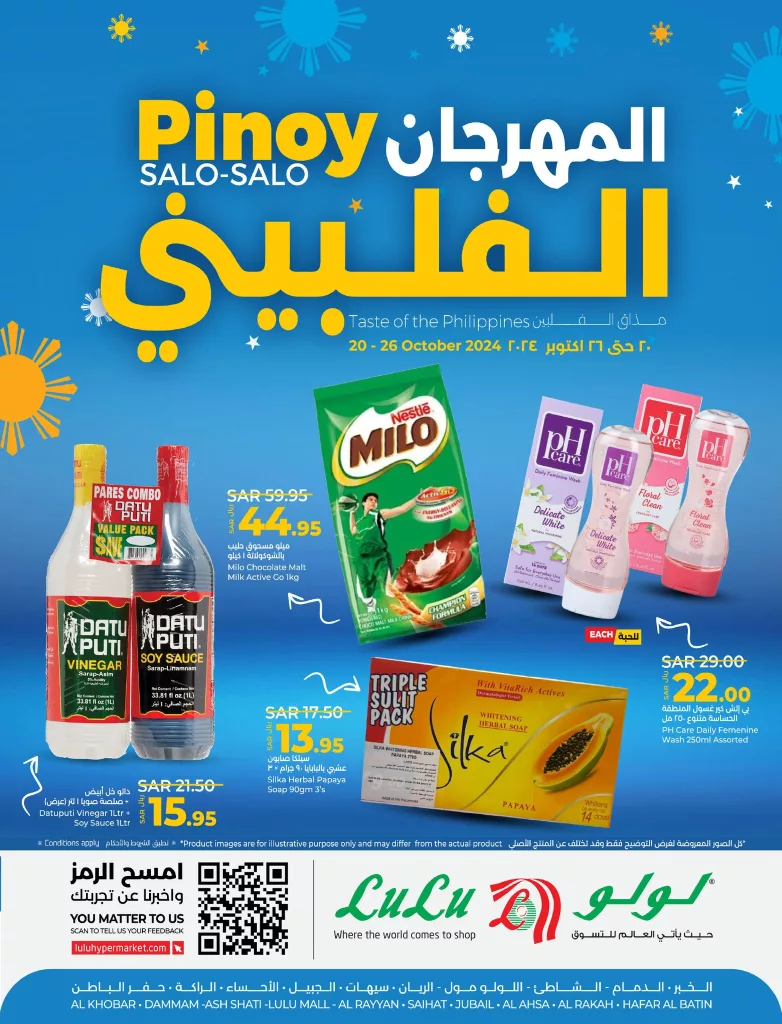 عروض لولو المنطقة الشرقية تقدم مجموعة متنوعة من المنتجات المميزة ضمن مهرجان الفلبيني حيث يشمل العرض تشكيلة واسعة من السلع الأساسية التي تلبي احتياجات العملاء مثل الأرز و النودلز والمعلبات بأسعار مخفضة. ستجد أيضاً العديد من العروض على الصلصات والتوابل
