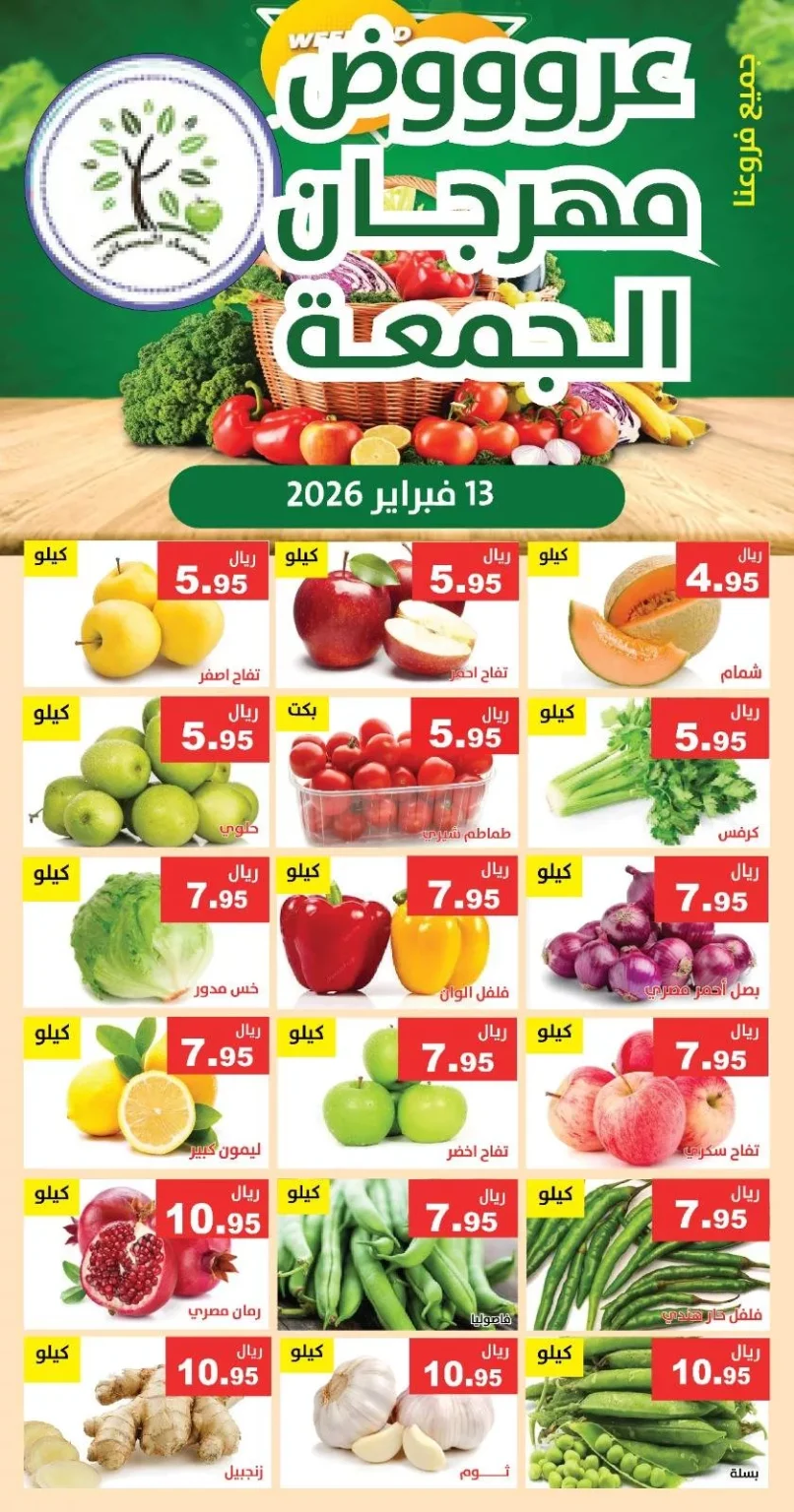 عروض مؤسسة حصاد البساتين الطازج الجمعة 13 فبراير 2026 الموافق 11 شعبان 1447هـ و تحتوي علي تشكيلة متنوعة من الخضروات والفواكه الطازجة تشمل البطاطس والبصل والطماطم والخيار والباذنجان والكوسة والزهرة والملفوف والفلفل والليمون والذرة والورقيات والفاكهة مثل الموز والمانجو والبرتقال .