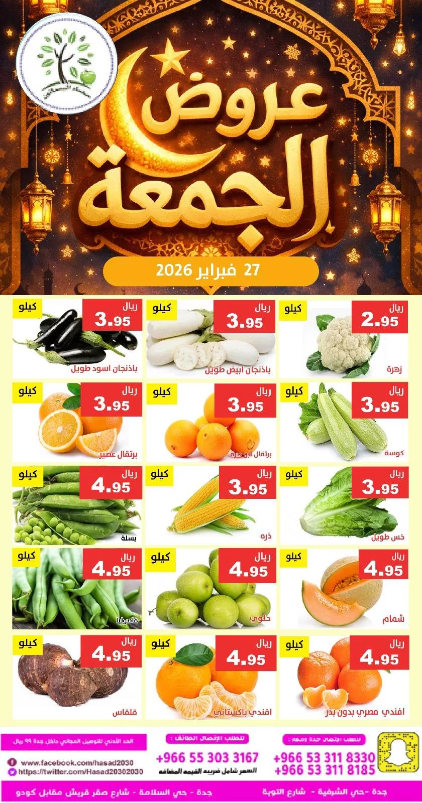 عروض مؤسسة حصاد البساتين الطازج الجمعة 27 فبراير 2026 الموافق 10 رمضان 1447هـ و تحتوي علي الخضروات الأساسية مثل الطماطم والخيار والبطاطا والكوسة والباذنجان والورقيات والملفوف بأنواعه .