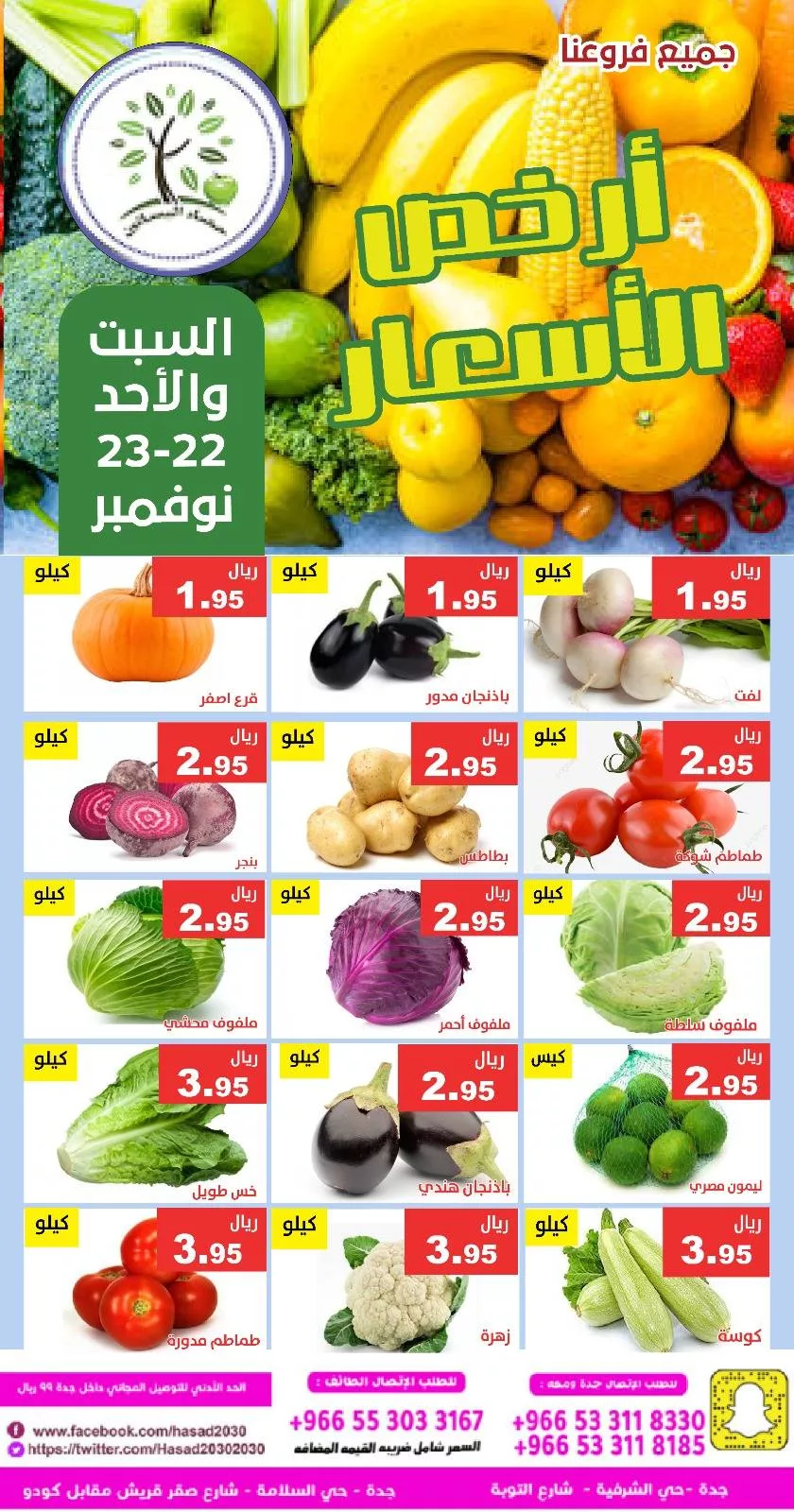 نقدم لكم اليوم احدث عروض مؤسسة حصاد البساتين السبت 22-11-2025 وتحتوي علي الأعشاب الخضراء مثل الشبت والكزبرة والبقدونس والسبانخ والبصل الأخضر بالإضافة إلى أصناف مثل الجرجير والنعناع والفجل الأحمر والملوخية بالاضافة الي فواكه وخضروات موسمية مثل الشمام والذرة والخيار والفراولة والطماطم والجزر