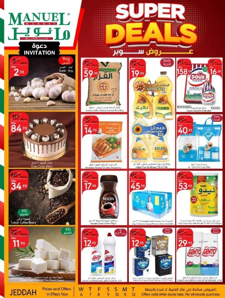 تقدم مانويل جدة الاربعاء 6 نوفمبر 2024 تشكيلة واسعة من العروض المميزة على مختلف المنتجات الأساسية والمتنوعة و تتضمن هذه العروض تخفيضات على المواد الغذائية مثل الأرز و الدجاج المجمد والزيوت لتلبية احتياجات الأسرة اليومية بأسعار منافسة كذلك يشمل العرض تشكيلة من الحلويات الطازجة والمخبوزات