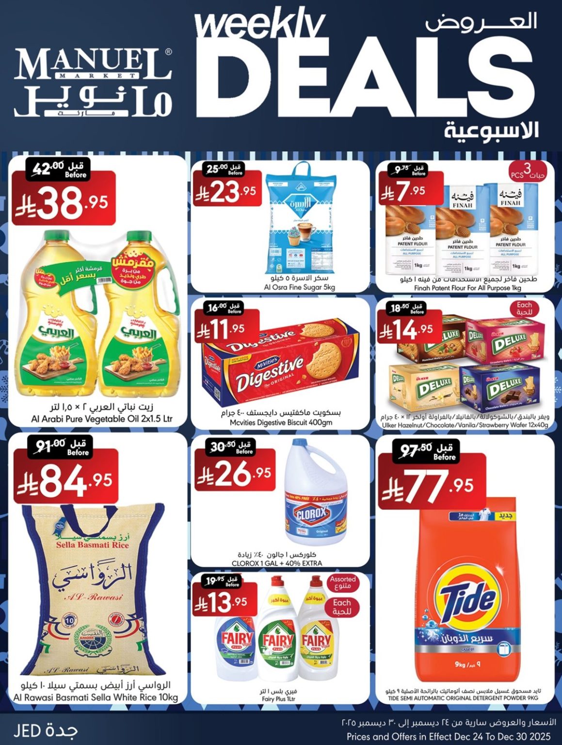 عروض مانويل جدة الخميس 5 رجب 1447هـ تبدأ بالمواد الغذائية و تشمل حبوب الإفطار ومعكرونة القمح والتونة المعلبة وصلصة الطماطم وزبدة الفول السوداني والبسكويت السادة والشوكولاتة الداكنة ثم تمتد إلى مستلزمات المنزل مثل مساحيق الغسيل ومناديل ورقية وسائل تنظيف الأرضيات وأكياس القمامة وغيرها من المنتجات و باسعار مميزة