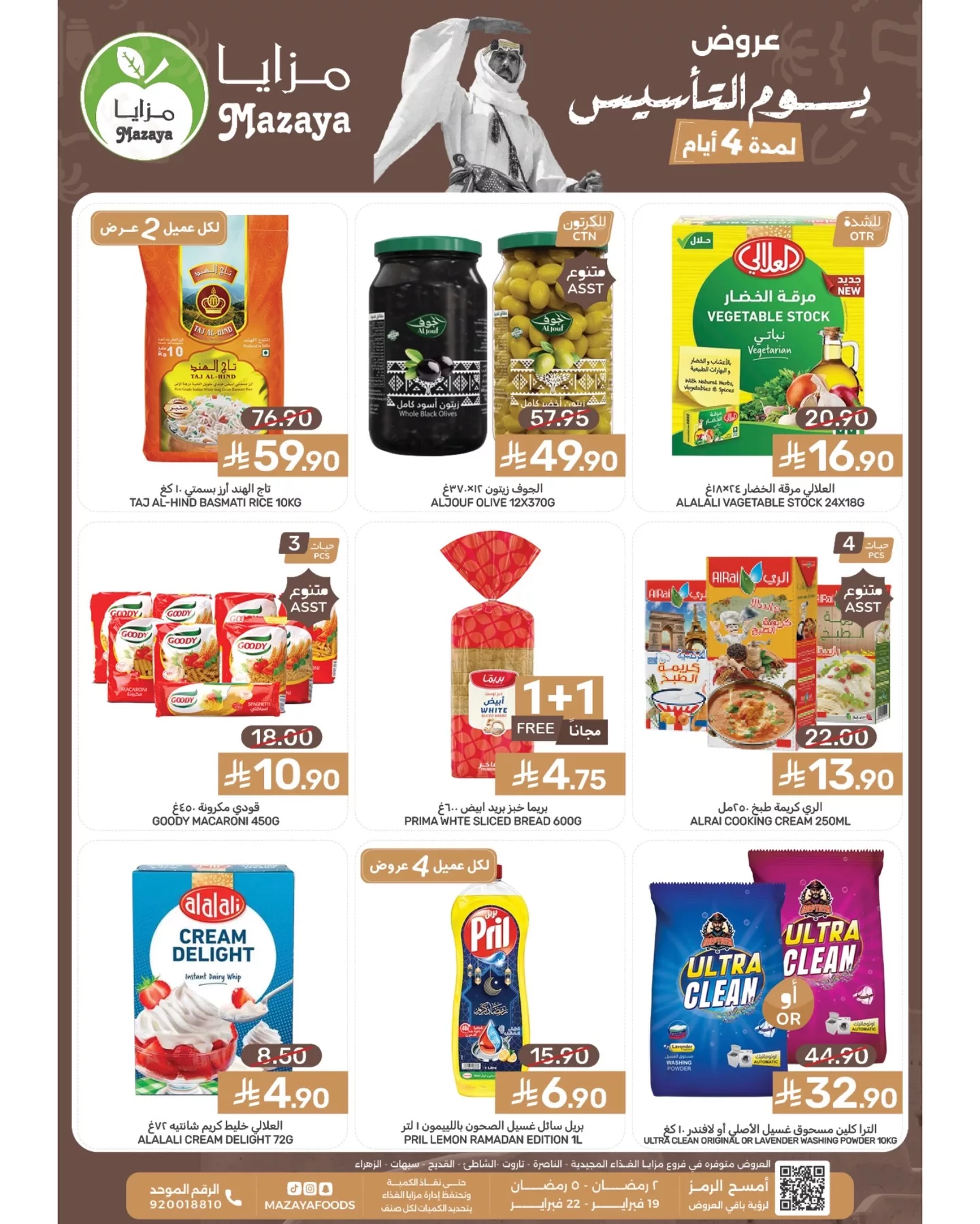 عروض مزايا الغذاء لمدة 4 ايام تخفيضات يوم التأسيس 19 فبراير 2026 افضل العروض الحصرية على المواد الغذائية و الاستهلاكية ضمن 4 ايام من التوفير ساري حتى 22 فبراير 2026 احتفالا بيوم التأسيس السعودي لا تفوتوا افضل العروض من المعلبات و السكر و الارز و الزيت و العديد من افضل العروض الاخرى
