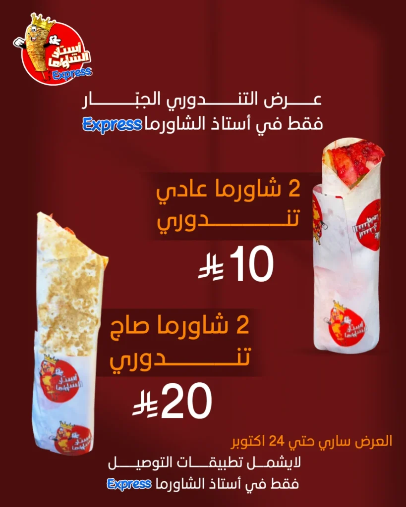 يقدم لكم مطعم أستاذ الشاورما عرض خاص على التندوري الجبار ساري حتى 24 اكتوبر 2025 وضمن جميع فروع المطعم في المملكة فقط