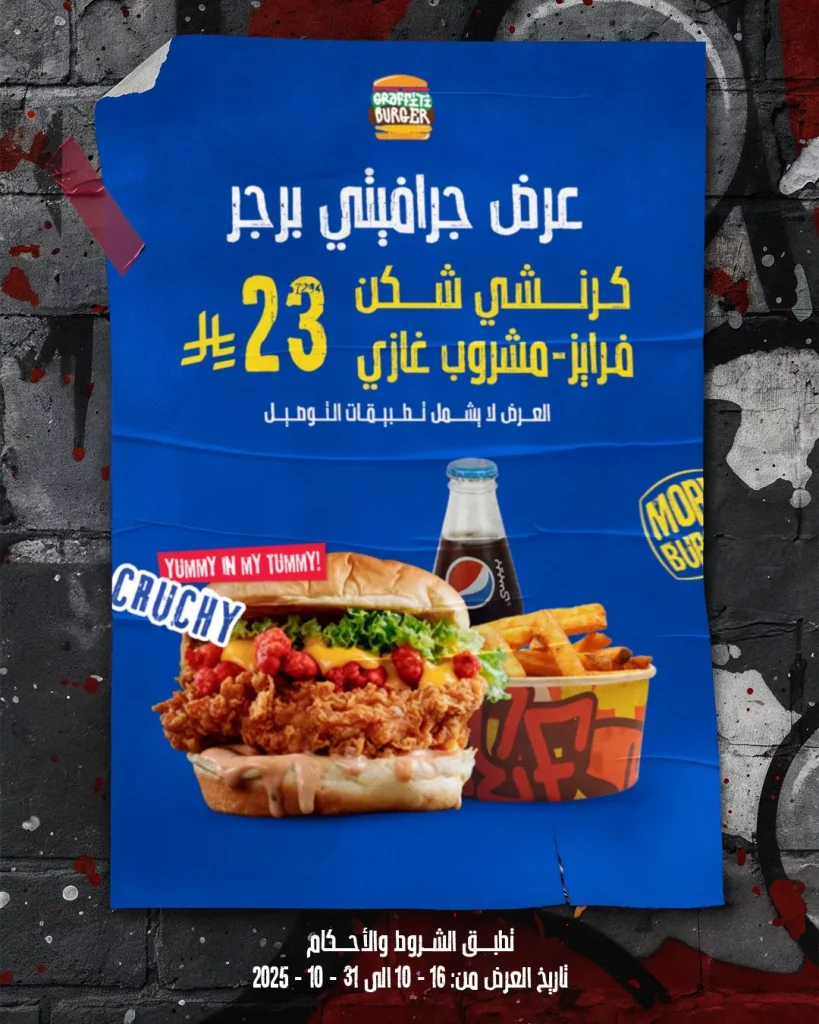 عروض مطعم جرافيتي برجر على كرنشي تشكن و بريوش حتى 31 اكتوبر 2025 اشهى الوجبات بأسعار منافسة هذه العروض مستمرة لنهاية الشهر لا تفوتوها.