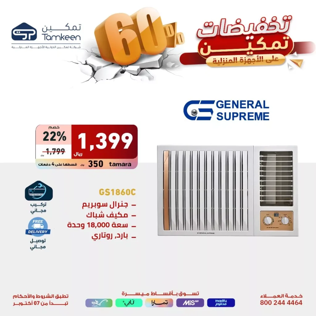 عروض تمكين تغطي مجموعة واسعة من الأجهزة المنزلية بما في ذلك مكيفات الشباك من علامات تجارية معروفة مثل جنرال سوبريم، ميديا وجري مما يضمن أداءً فعالا وجودة ممتازة كما توفر تمكين خيارات توصيل مجانية للعديد من المنتجات مما يسهم في تجربة شراء مريحة ومميزة للعملاء.