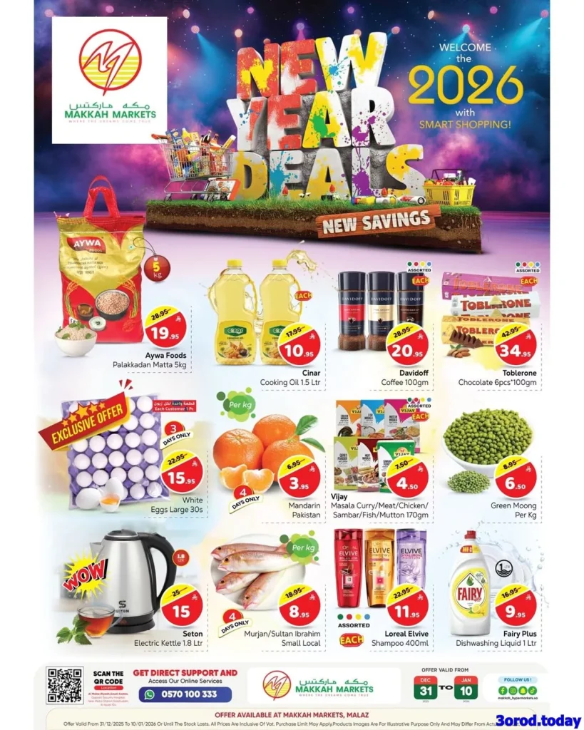 عروض مكة هايبر ماركت الاسبوعية و التي تستمر حتي السبت 10-1-2026 الموافق 21 رجب 1447هـ وبمناسبة تخفيضات العام الجديد بتقدم تشكيلة من منتجات متنوعة منها غذائية و منها ادوات المطبخ و مستلزمات تحضير الطعام و في عروض حصرية تتممتع بخصومات مميزة في الاسعار ابقوا معنا ولا تفوتو الفرصة