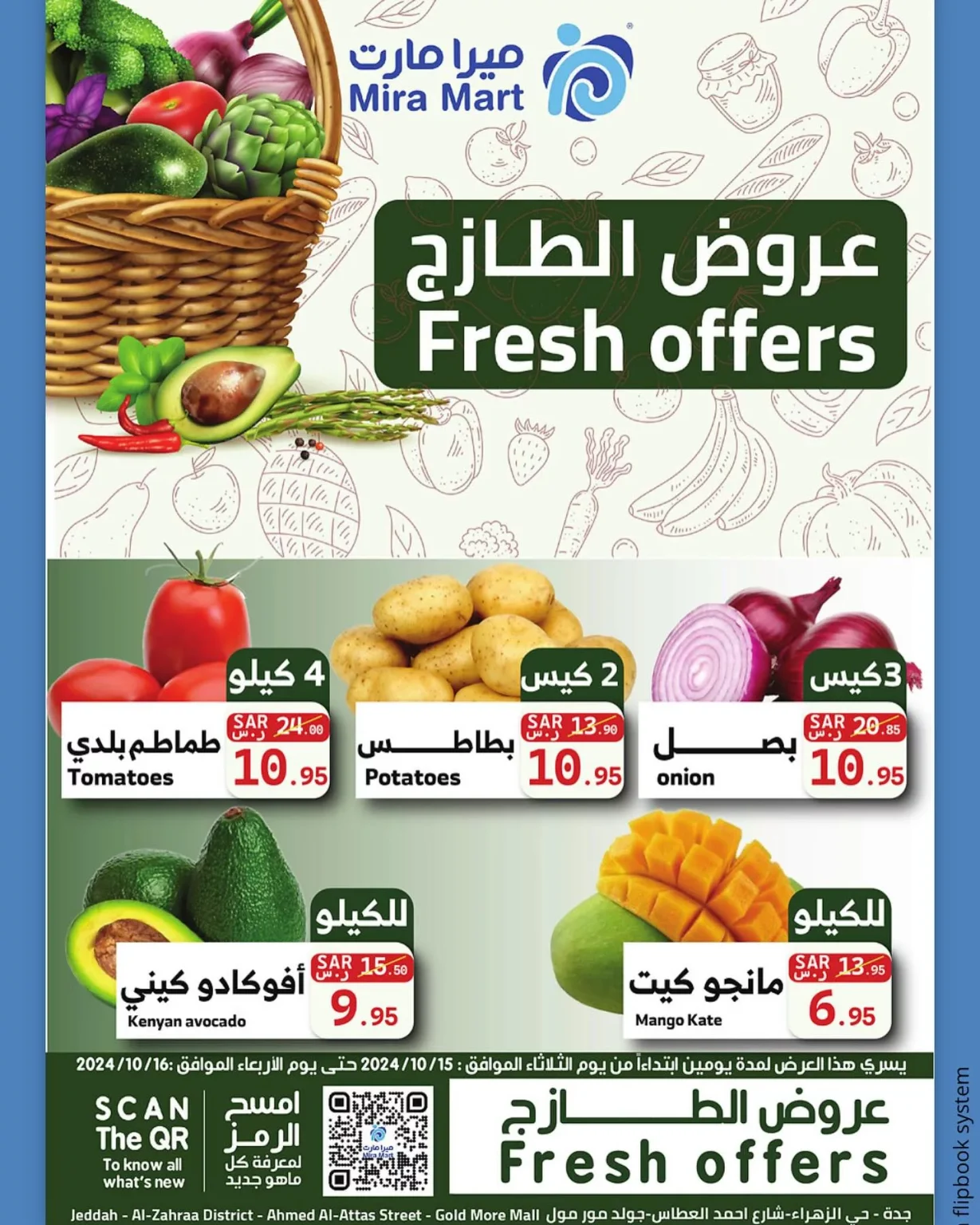 كما تشمل عروض ميرا مارت الخضروات والفواكه الطازجة بأسعار مغرية مثل الطماطم البلدي و البطاطس والبصل إلى جانب فواكه مثل الأفوكادو الكيني والمانجو إضافة إلى ذلك هناك مجموعة من اللحوم الباردة والمخبوزات التي تُضفي تنوعا مميزا للعروض لتلبية جميع الأذواق.