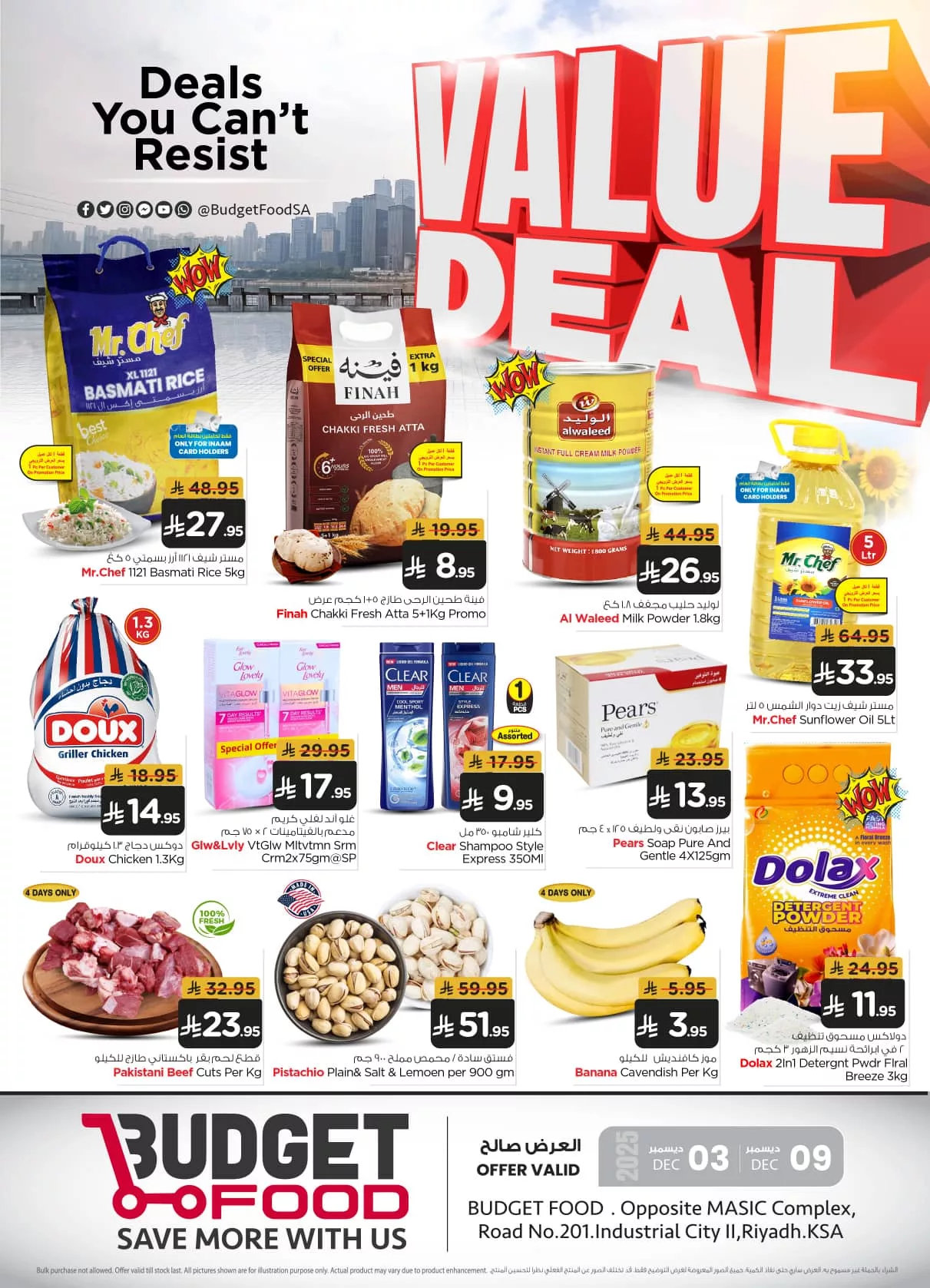 عروض ميزانية الطعام الأربعاء 3/12/2025 تضم أجهزة منزلية تشمل مقلاة هواء صغيرة ومحضر بسكويت كهربائي وغلاية ماء معدنية وخلاط يدوي بسيط وصانع شطائر منزلي ثم تمتد السلع الغذائية إلى الطماطم الوردية والبصل الأصفر والبطاطس الكبيرة والعنب الأبيض والتفاح الأحمر مع الجبن الأبيض وقطع اللحم الجاهزة