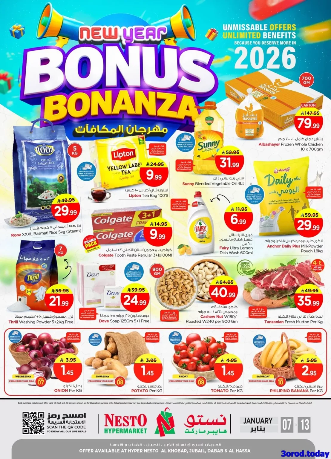 عروض نستو الدمام الأربعاء 7 يناير 2026 الموافق 18-7-1447هـ و تبدأ بالأغذية المتنوعة منها الخس والكراث والجزر الأصفر والطماطم والأناناس والبرقوق والحليب واللبنة الخفيفة والجبن الكريمي وزيت الزيتون ودقيق الحلويات ثم تمتد إلى الأجهزة المنزلية و بتوفر فرن كهربائي وصانعة وافل ومحمصة ساندويتش وخلاط طاولة و ادوات تحضير الطعام