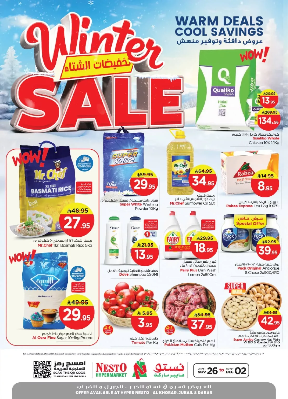 عروض نستو الدمام 26/11/2025 تضم منتجات غذائية تشمل الخيار والبصل والأناناس والفراولة والجبنة القريش وسلطة السيزر الجاهزة إضافة إلى شرائح لحم البقر ثم تأتي الأجهزة المنزلية التي تشمل شوايات ألواح عميقة وخلاطات زجاجية وقدور طهي بطيء وسخانات ماء فورية ومحضرات عجين عملية غيرها باقل الاسعار المناسبة للجميع