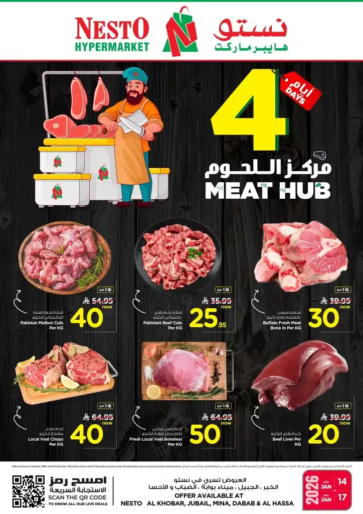 عروض نستو الدمام الاربعاء 25-7-1447هـ الموافق 15 يناير 2026 و تحتوي علي اللحم المفروم واللحم البقري والكبدة والكباب و بيقدم كمان تشكيلة متنوعة من الدجاج الطازج والفروج والصدر والأجنحة واللحم الضأني لفترة محدودة باسعار مميزة تابعونا علي موقعكم عروض توداي ليصلكم كل جديد عن عروض السعودية