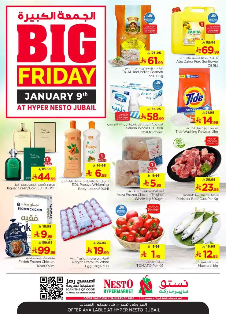 عروض نستو الدمام الويكند الجمعة 9-1-2026 الموافق 20 رجب 1447هـ و تحتوي علي تشكيلة من المنتجات المختلفة منها الغذائية كالخضروات و الفواكه و اللحوم الشهية و ايضا بتوفر منتجات النظافة و بجانب ذلك بتوفر الالكترونيات من اجهزة المنزل الحديثة و ايضا مختلف من ادوات المطبخ و تحضير الطعام و باسعار مميزة متاحة اليوم فقط