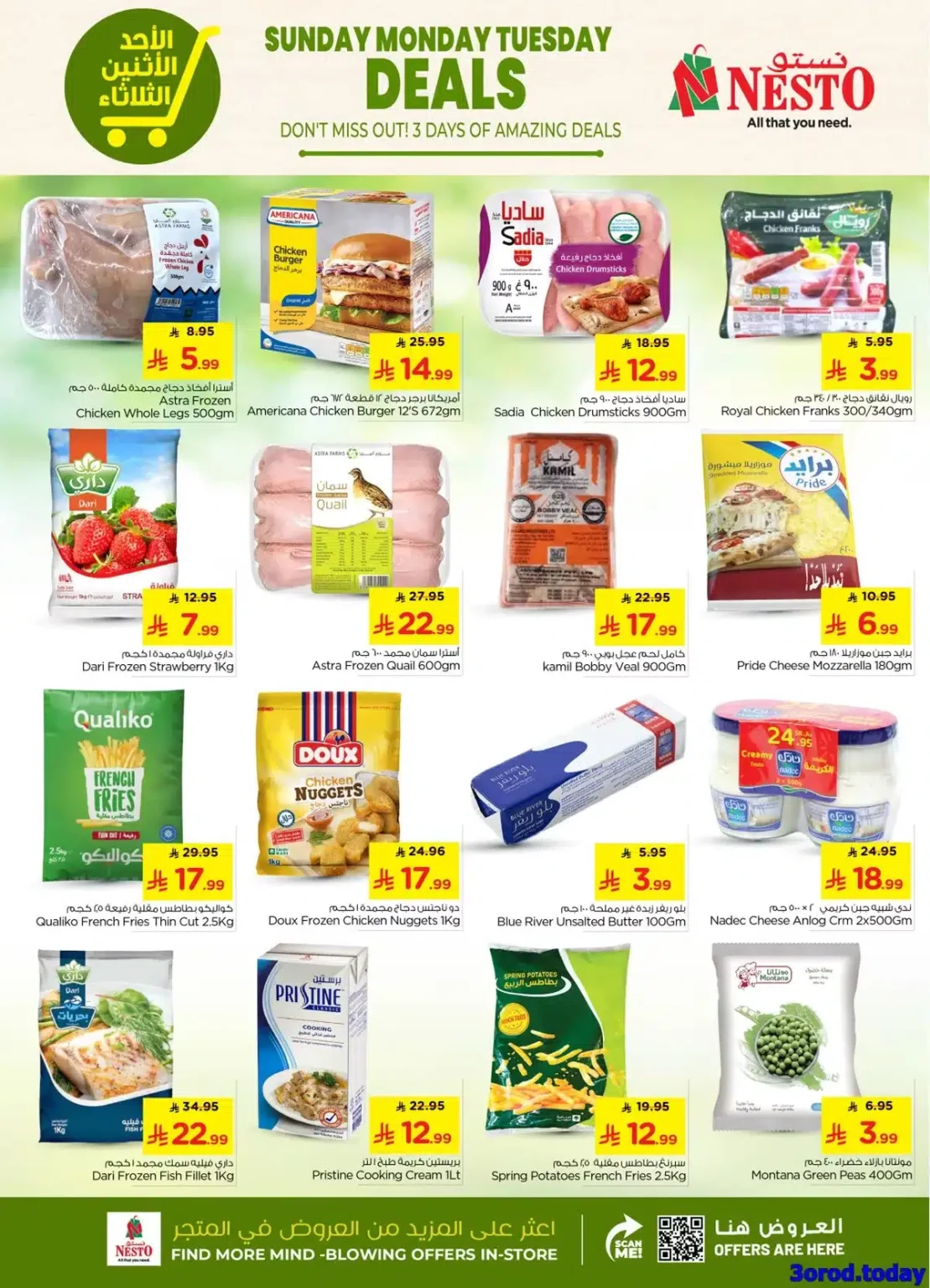 تحتوي عروض نستو القصيم علي : صدور دجاج ساديا – أفخاذ دجاج أسترا – برجر دجاج أمريكانا – سكر ناعم – أفخاذ دجاج ساديا – نقانق دجاج رويال – فراولة مجمدة داري – سمان مجمد أسترا – لحم عجل بوبي كامل – شاي أكياس – بطاطس مقلية كواليكو – ناجتس دجاج دو – زبدة بلو ريفر – شبيهة جبن كريمي نادك