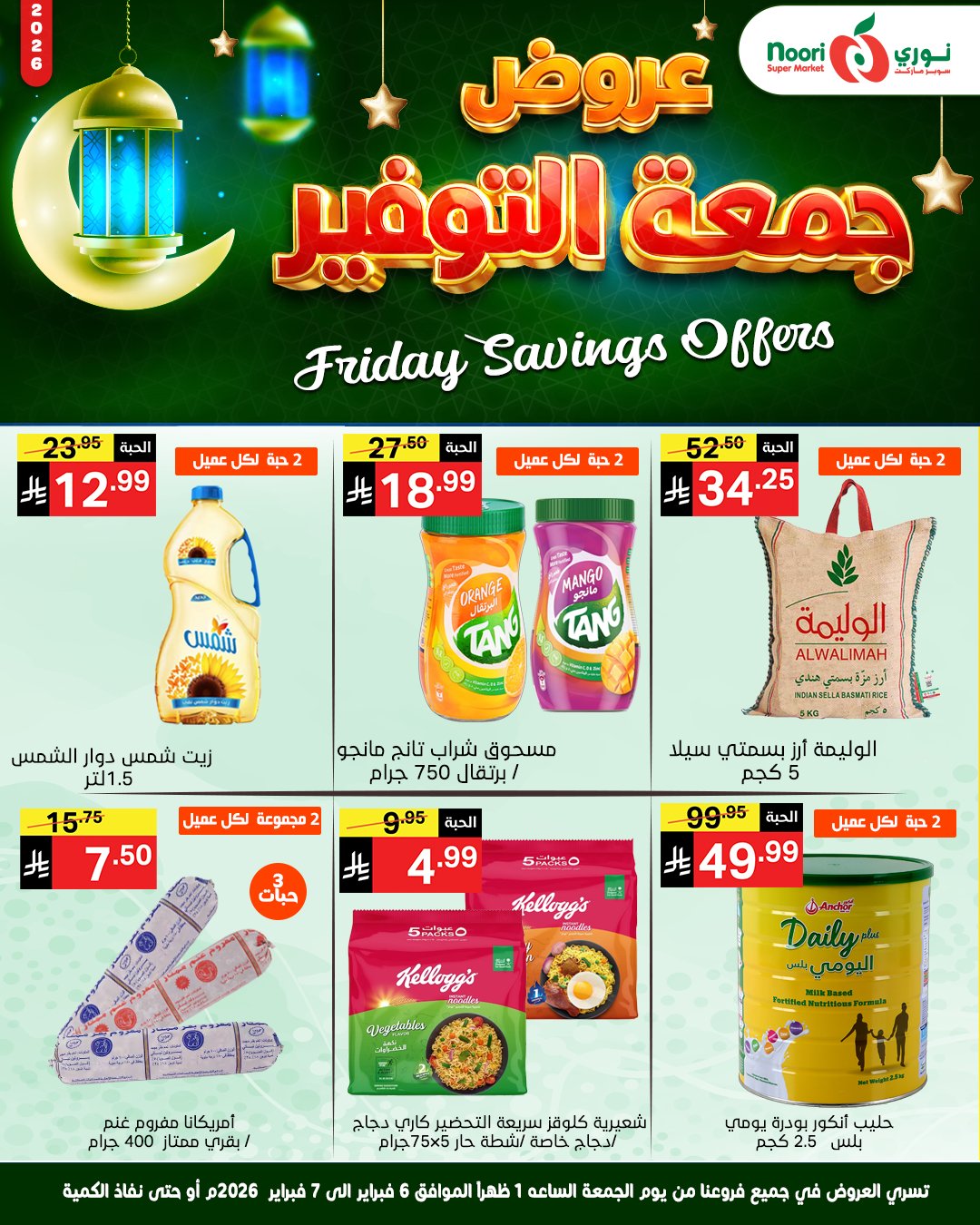 عروض نوري سوبر ماركت جمعة التوفير 6 فبراير 2026 ليومين فقط العرض ساري يوم الجمعة و السبت 6 و 7 فبراير 2026 في جميع فروع اسواق نوري السعودية استفيدوا من اقوى تخفيضات نهاية الاسبوع المميزه