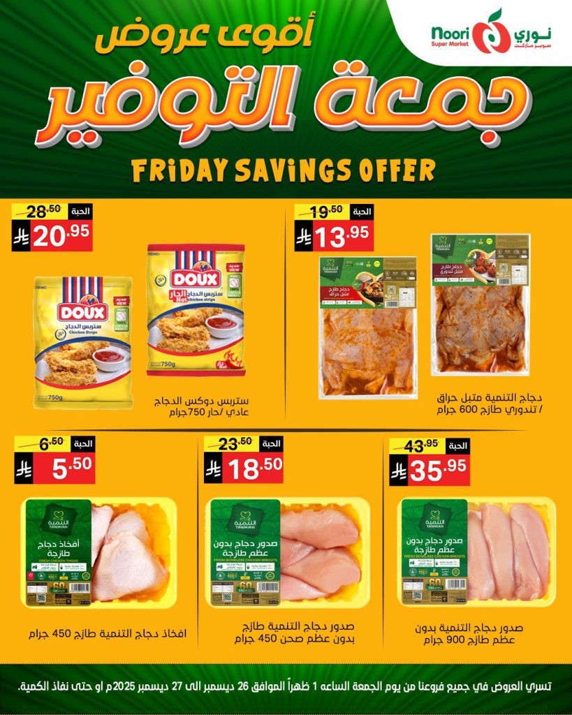 عروض نوري هايبر ماركت اليوم الجمعة 26 ديسمبر 2025 و تحتوي علي زيت دوار الشمس وورق عنب قلب الطبيعة وعسل وشعيرية دورا سريعة التحضير ودقيق مخابز المطاحن الحديثة بالإضافة إلى جبنة مثلثات برايد ومجموعة من المنتجات المجمدة مثل دجاج فقية كامل وقطع دجاج فقيقه المشكلة وتونة وغيرها من المنتجات باقل الاسعار