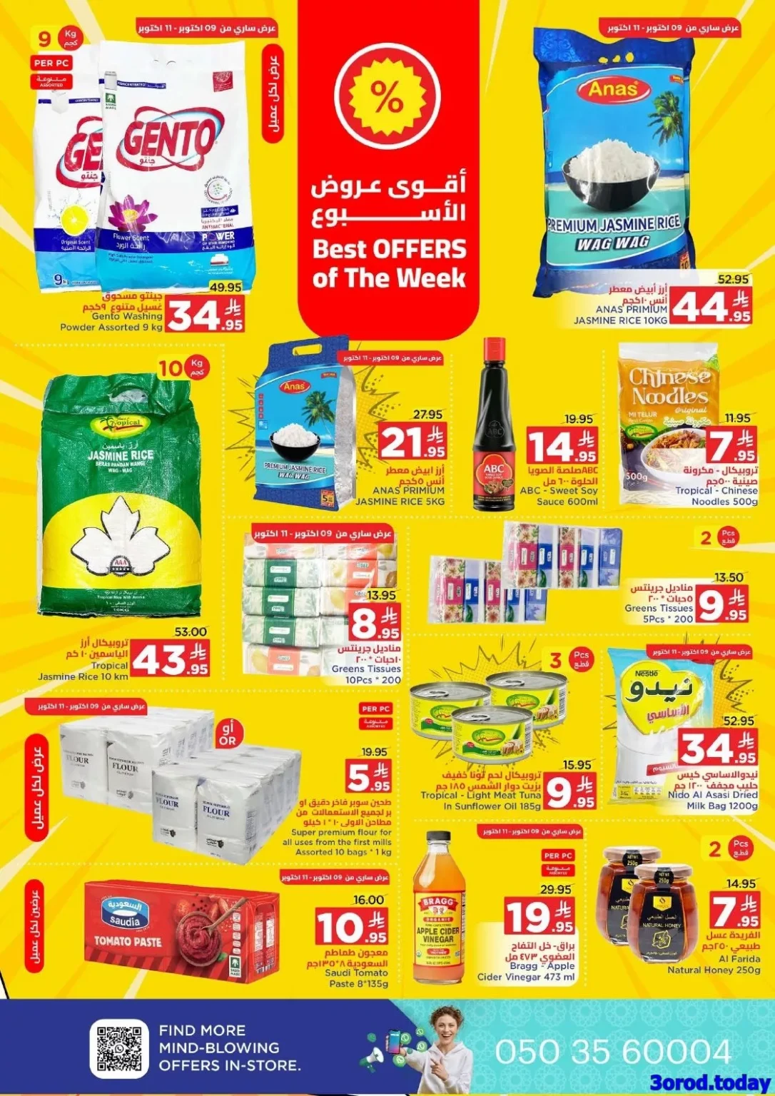 عروض وهج مارت السبت 11-10-2025 تقدم تشكيلة متنوعة من المنتجات الغذائية والمنزلية حيث تتوفر تشكيلة واسعة من الأرز بأنواعه المختلفة مثل الأرز البسمتي والأرز الياسمين بالإضافة إلى الحليب المجفف وعصائر الفواكه وأصناف متعددة من المنظفات ومساحيق الغسيل كما تشمل العروض منتجات البقوليات والمعلبات والمكرونة