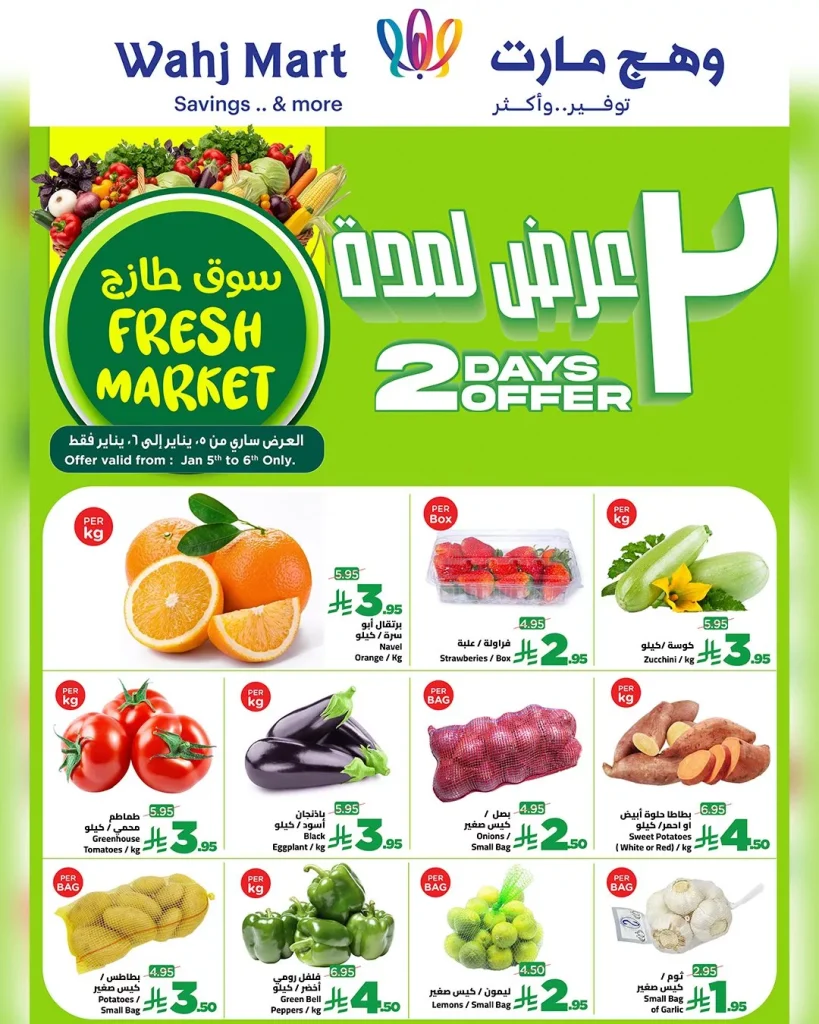 عروض وهج مارت الطازج الاثنين 16-7-1447هـ الموافق 5 يناير 2026 و بتحتوي علي الخضروات الطازجة كالطماطم و الليمون و البطاطس و الفواكه الفريش منها البرتقال و الفراولة و بالاضافة كمان بتوفر افضل اصناف اللحوم و الاجبان المشكلة و غيرها من المنتجات باسعار مميزة لمدة يومان ابقوا معنا ليصل اليكم كل جديد