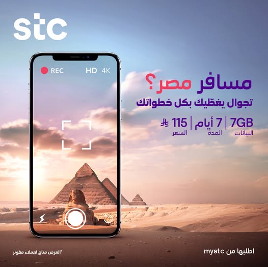 استمتع بتجوالك في مصر مع باقة مصممة لاحتياجك 7 جيجابايت بيانات لمدة 7 أيام فقط بـ 115 ريال اطلبها الآن عبر تطبيق mystc و استمتعوا بأفضل تجربة سفر مع اس تي سي ملاحطة العرض متاح لعملاء مفوتر