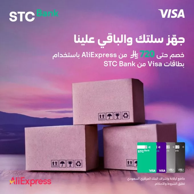 عروض stc بنك خصم يوصل لـ 720 ريال باستخدام بطاقات Visa في علي اكسبرس استفيدوا من افضل عروض التوفير و تسوقوا كل ماتحتاجونه