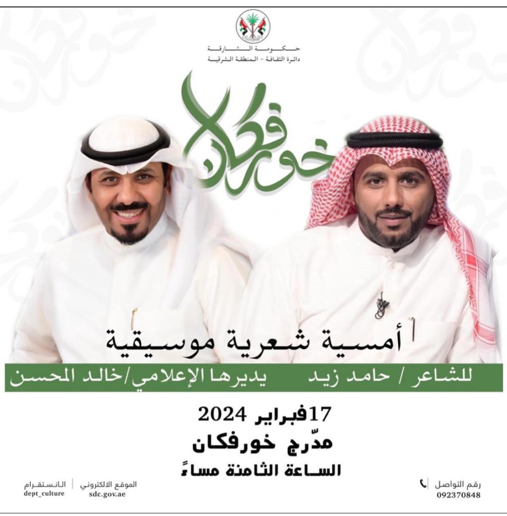 يحل الشاعر الكويتي حامد زيد ضيفاً على مدينة خورفكان الإماراتية غداً السبت 2024/2/17 في الأمسية الشعرية الموسيقية التي يحييها بإدارة الشاعر الكويتي المميز خالد المحسن الساعة 8.00 مساءاً على مدرج خورفكان.