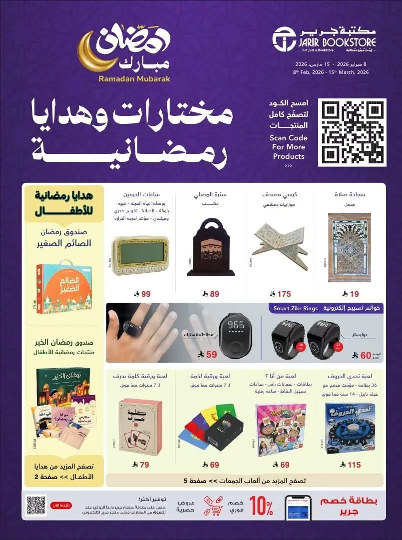 عروض جرير مستمرة معاكم حتي الاحد 15-3-2026 الموافق 26 رمضان 1447هـ و تحتوي علي مستلزمات العبادة كالمصاحف والسجاد والساعات الإلكترونية وصناديق تعليمية للأطفال
