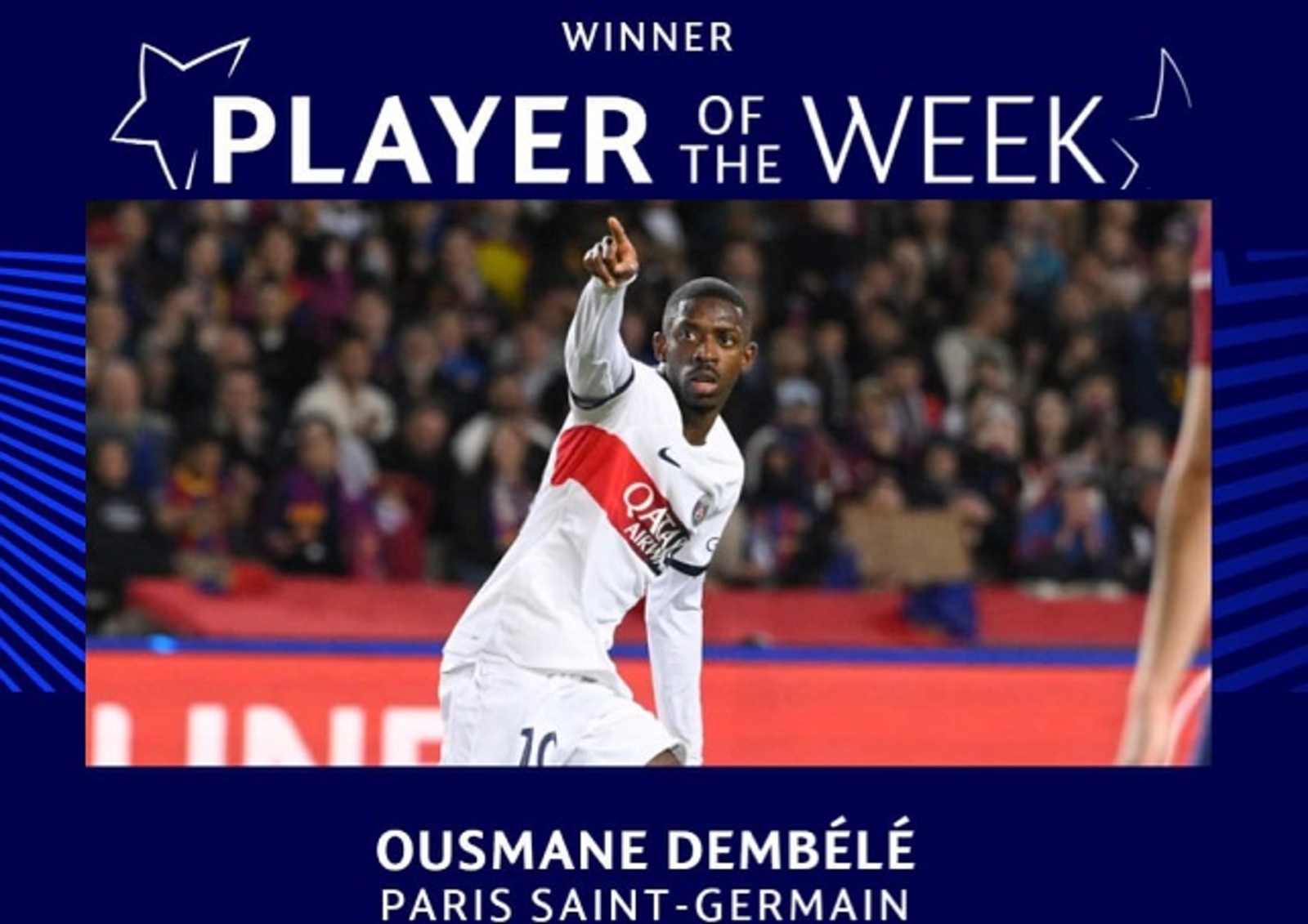 فاز النجم الفرنسي عثمان ديمبيلي لاعب باريس سان جيرمان الفرنسي بجائزة أفضل لاعب في اياب الدور ربع النهائي لبطولة دوري أبطال أوروبا.