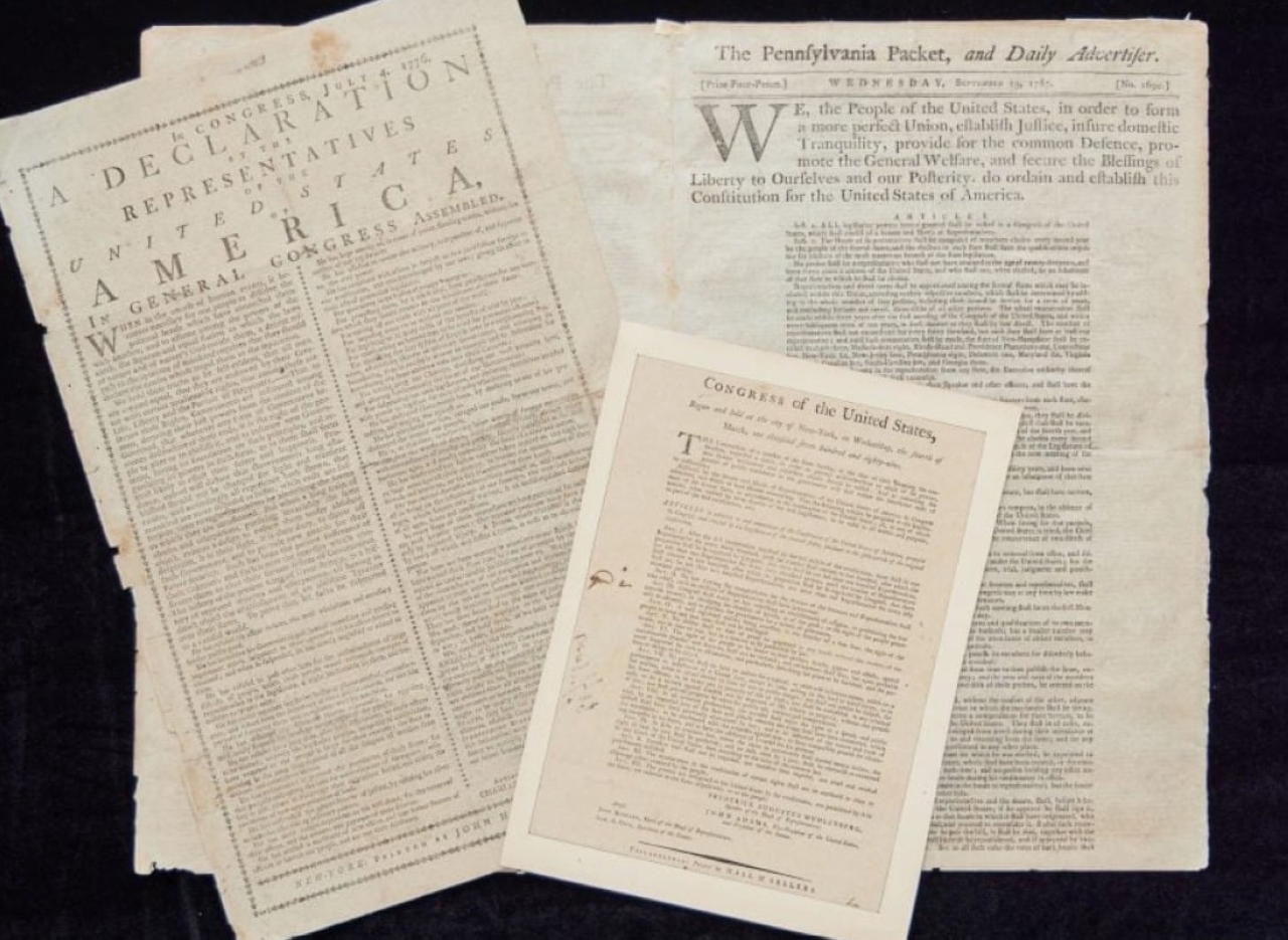 تقدم دار سوثبي للمزادات في نيويورك، في مزاد حي مستقل، مطبوعات نادرة لإعلان الاستقلال الأمريكي والدستور ووثيقة الحقوق في 26 يونيو الجاري، بقيمة إجمالية قدرت بـ8 ملايين دولار. وتم وضع علامة على «إعلان الاستقلال» بما يصل إلى 5 ملايين دولار، و«ميثاق الحقوق» بما يصل إلى 2 مليون دولار، و«الدستور» بما يصل إلى مليون دولار، وفقاً لما نشره موقع «نيوز آرت.نت».